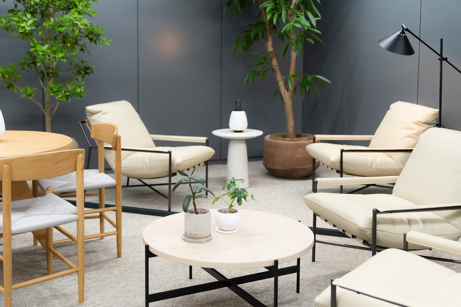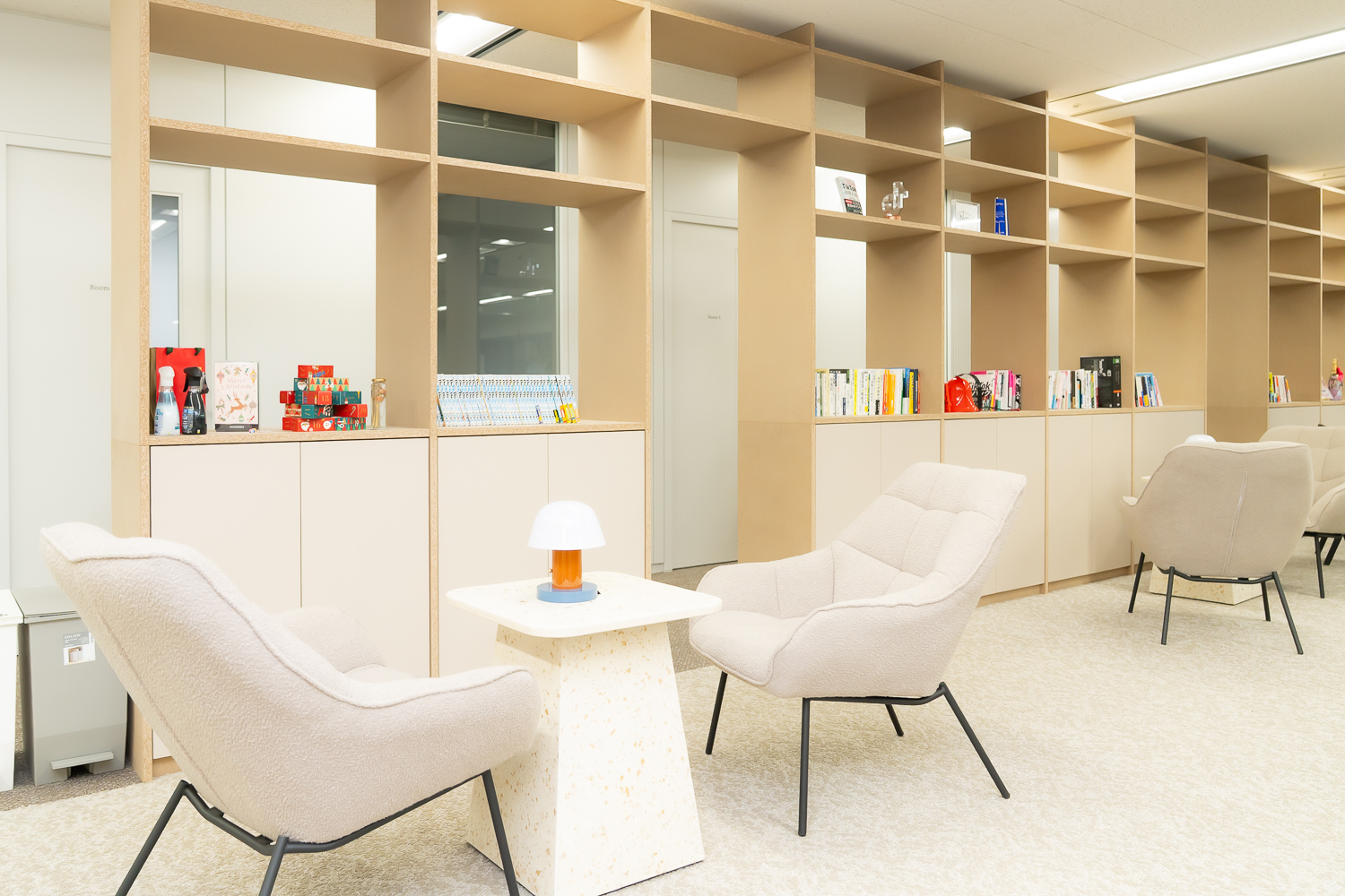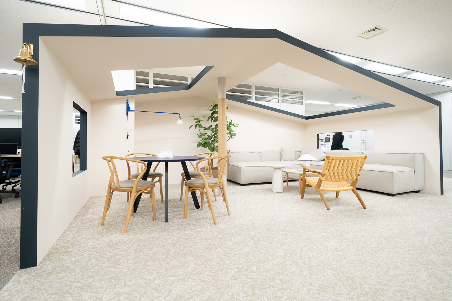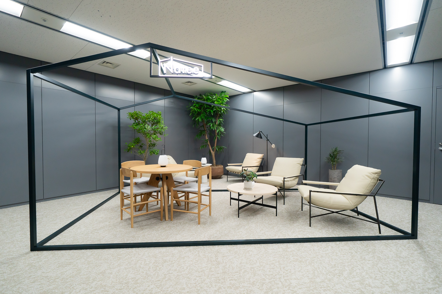 エントランスとラウンジエリアに、コーポレートロゴの「家」を立体的にデザインしたスペースをつくりました。このロゴには、Nateeは挑戦を続けるメンバーにとっての原点であり、次の挑戦に向けてエネルギーを蓄えられる場所でもありたいという意味が込められています。