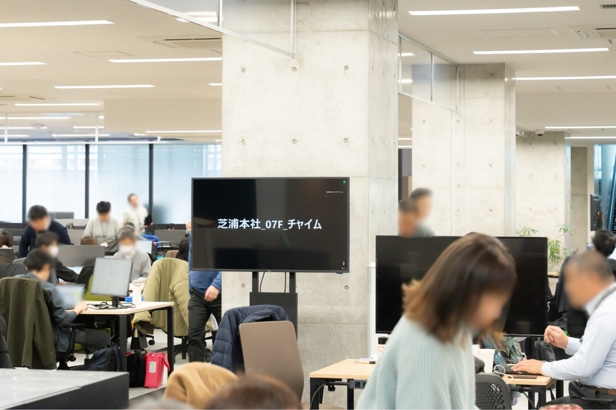 フロア内のサイネージは始業・就業時にはチャイムが鳴り、10時、15時には体操の音楽が流れる仕組みも。他の拠点ともつながることができる仕掛けです。