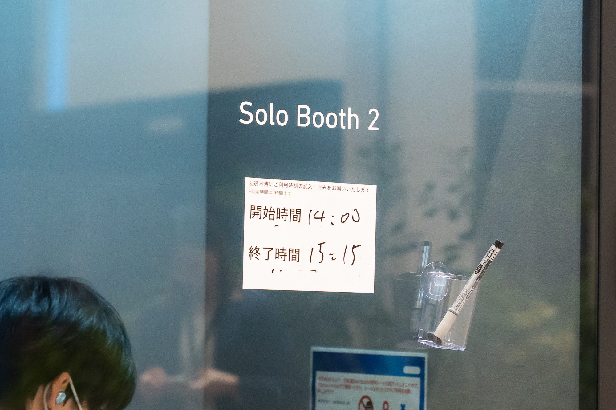 利用時間は、各ブースの扉に貼り付けたホワイトボードに自分で記載。手軽に取り入れられるアイディアです。