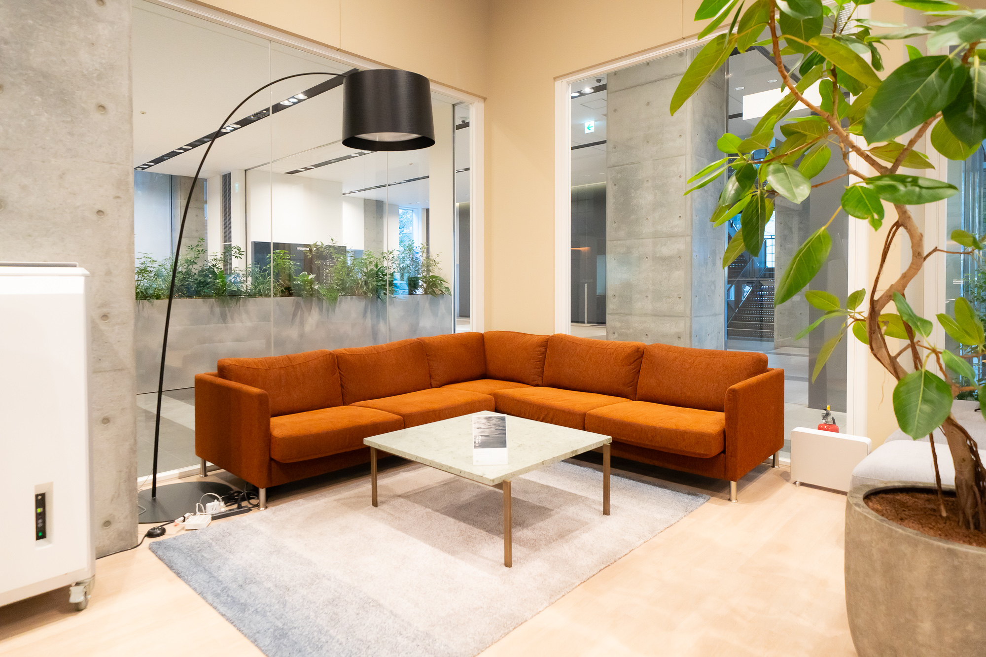 エントランスを入った中には、グループ社員も使うことができるタッチダウンエリアがあります。