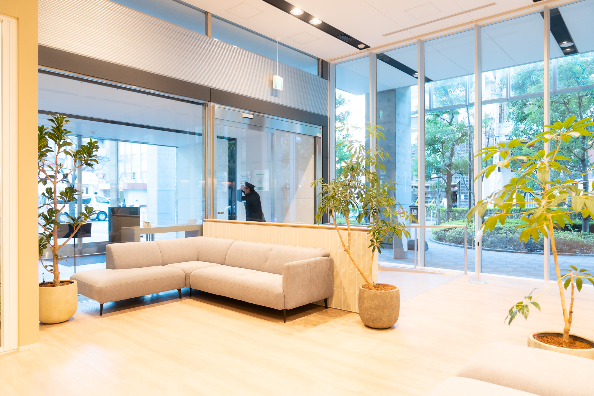 デザインにこだわられたというエントランス。五感を大切に、緑やアロマ、季節に応じて照明のカラーを調整するなど、一工夫もされています。