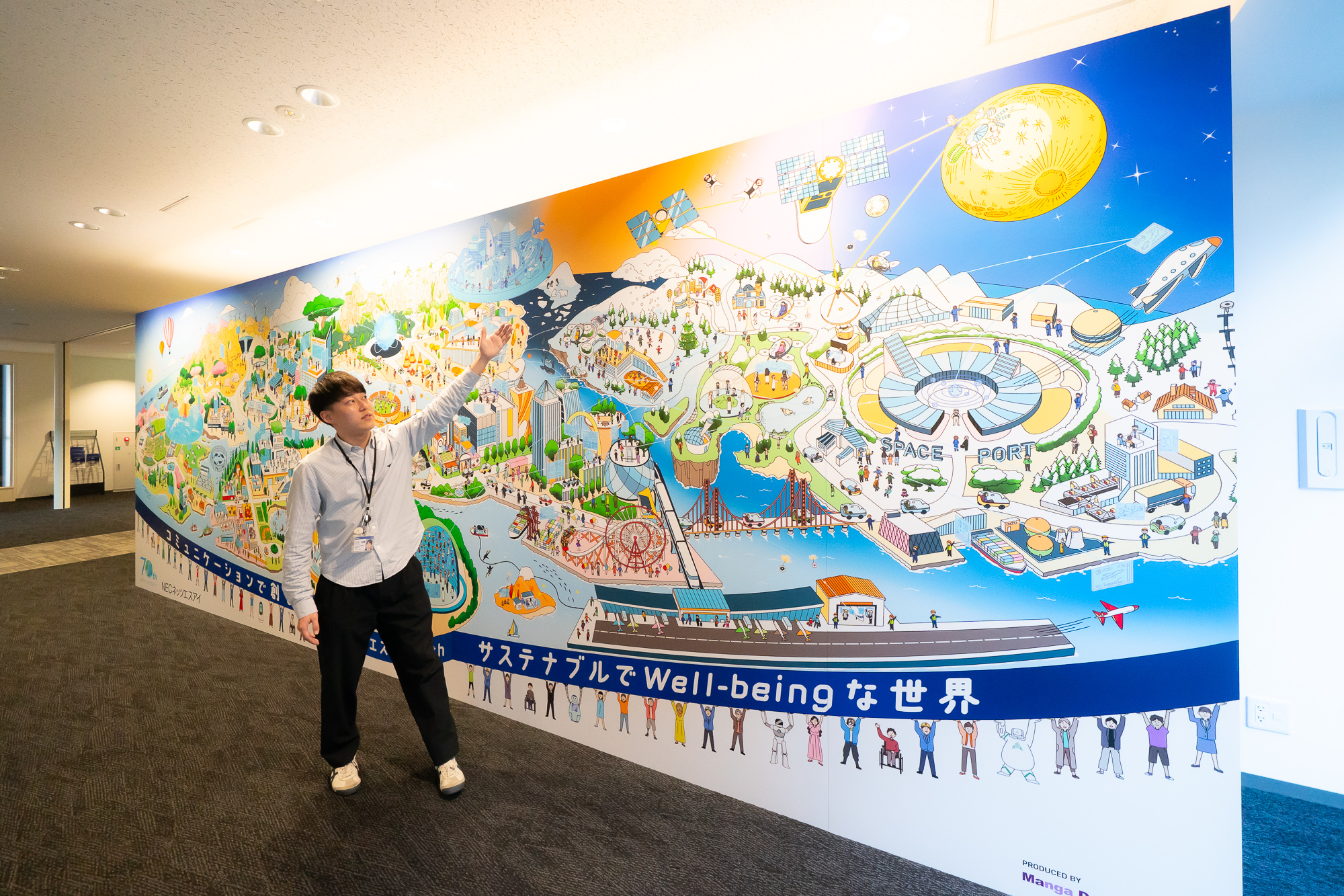 2階壁面に描かれているのは、2023年に70周年を記念して描かれたもの。海底から宇宙まで、NECネッツエスアイの事業領域と目指す未来とが描かれています。