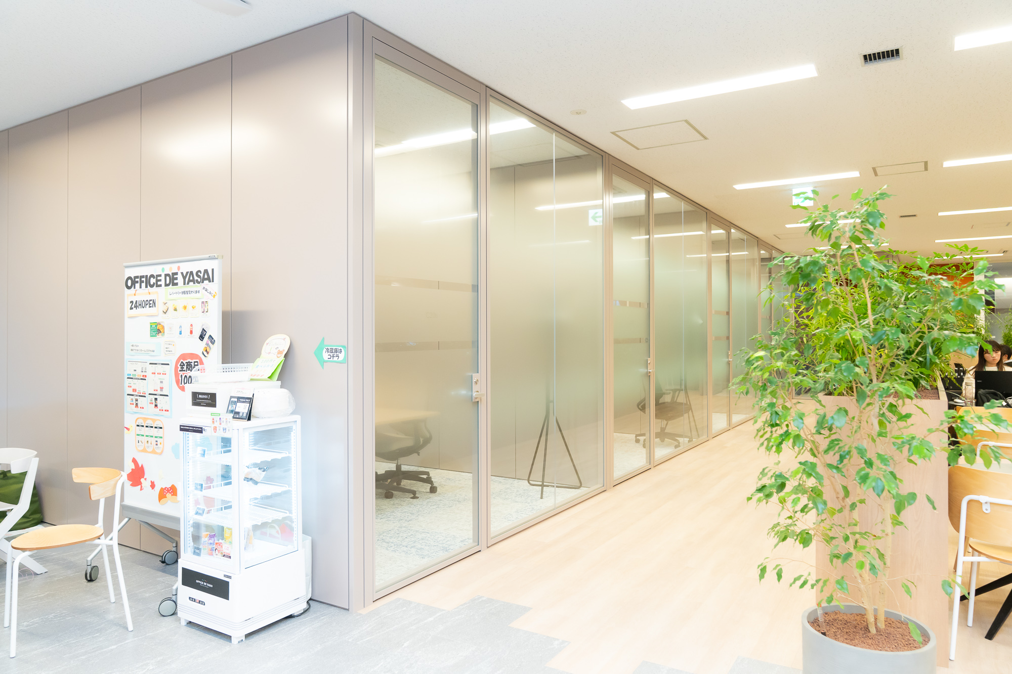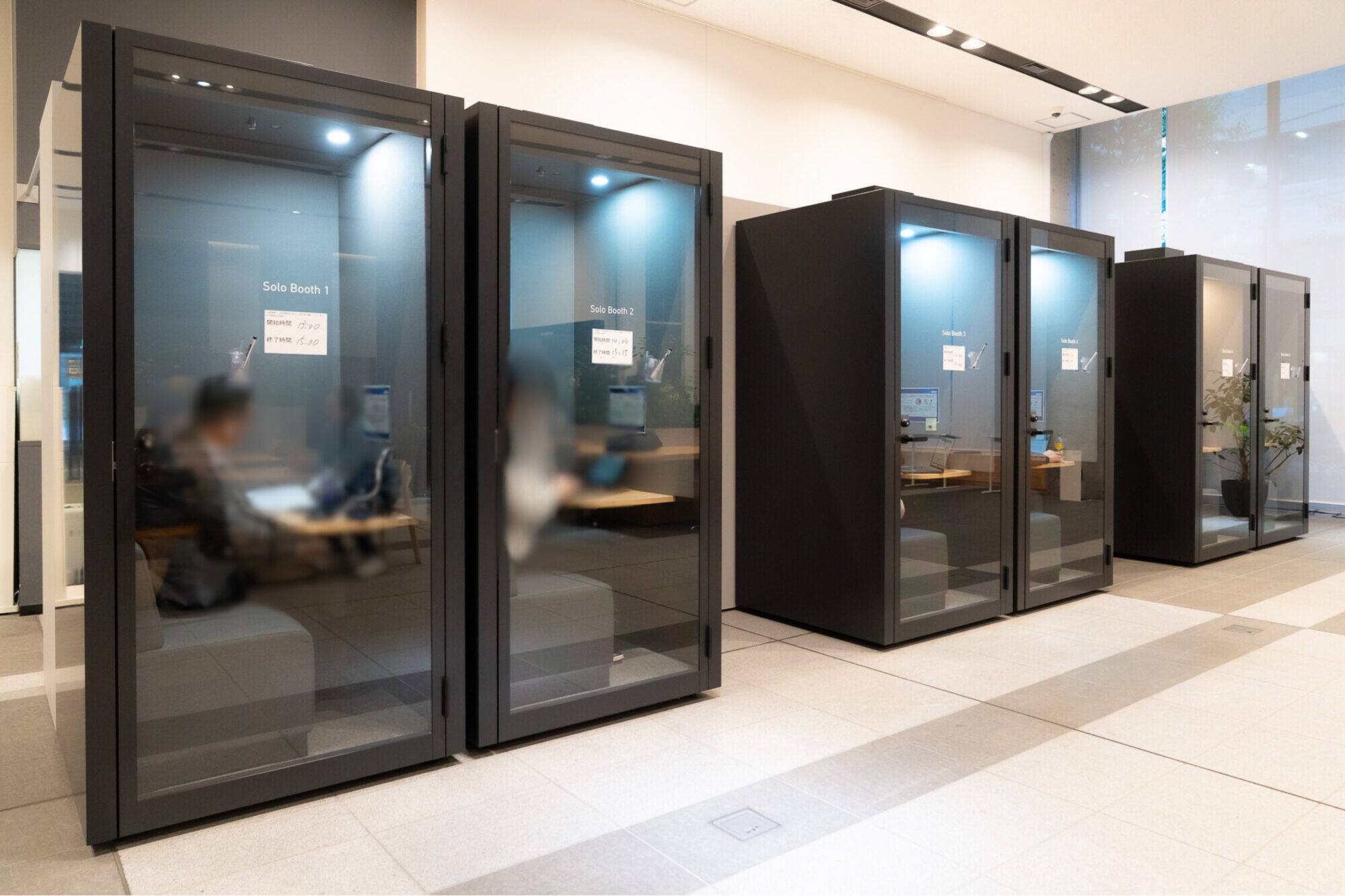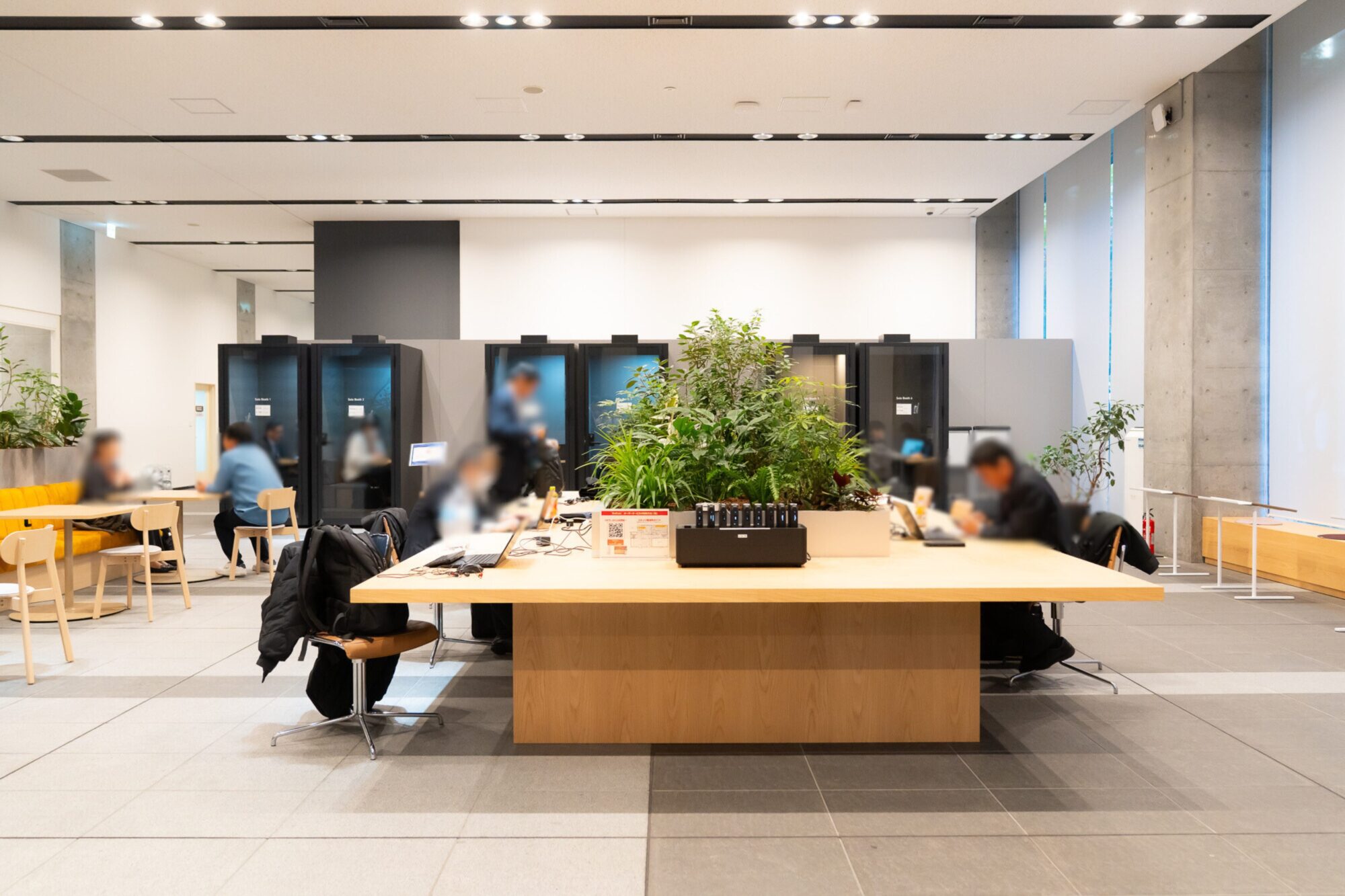 奥には、個室ブースも。当初は自由に使えるようにしていたそうですが、一部で専有する方や飲食マナーに問題のある方が見受けられるようになったことから、運用ルールを変更。飲食は禁止とし、用途を会議や電話と明記。1人あたり1回の利用時間を最大2時間としました。
