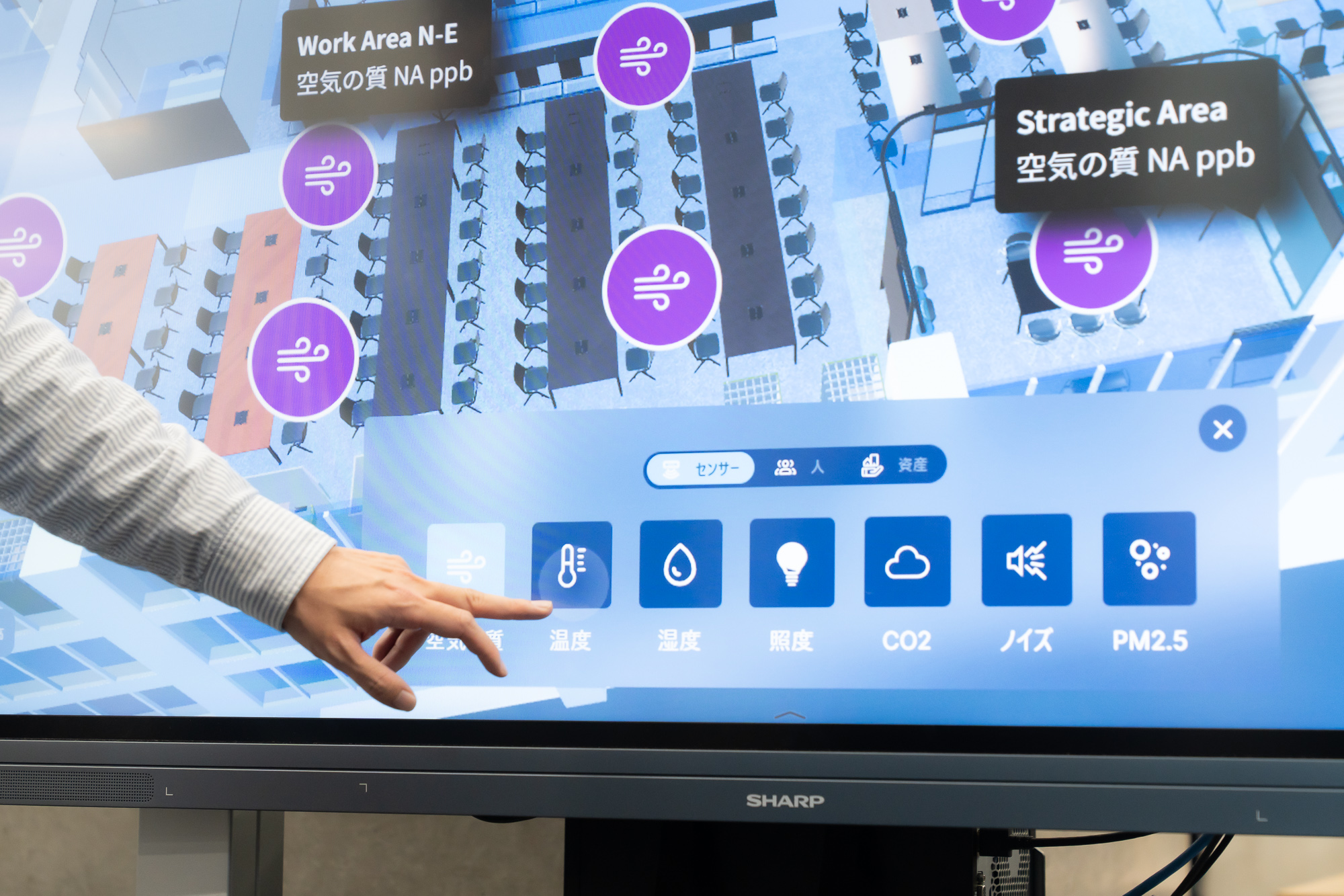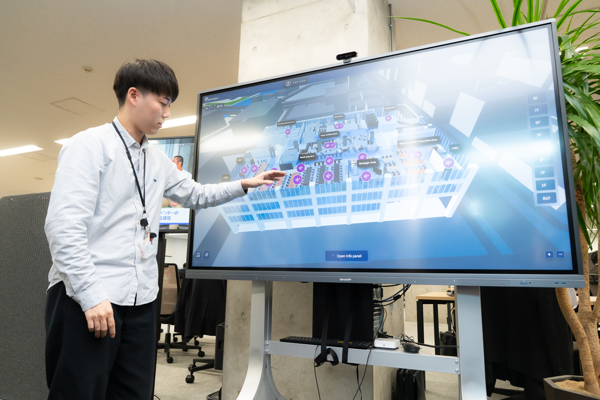 4階のフロア入口には自社実践として自社のソリューションが設置されています。フロア内の環境状態を3Dマップで可視化。タッチパネルになっており、温度や湿度、CO2濃度など、自由に確認することができます。人の出入りは出入口にあるカメラでカウントされています。