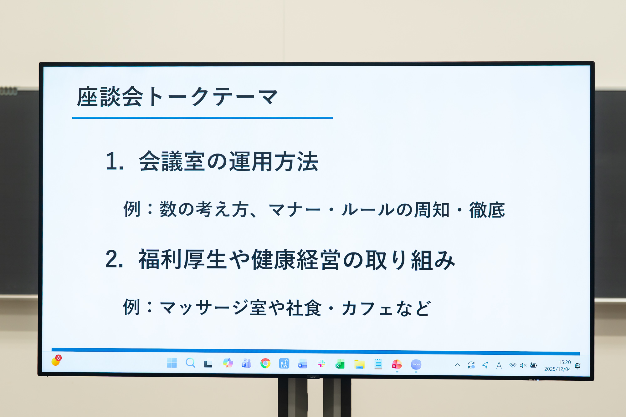 今回、ご用意したトークテーマは「会議室の運用方法」「福利厚生や健康経営の取り組み」。こちらをベースに、各グループの参加者が今気になるテーマを持ちより、情報交換を行いました。
